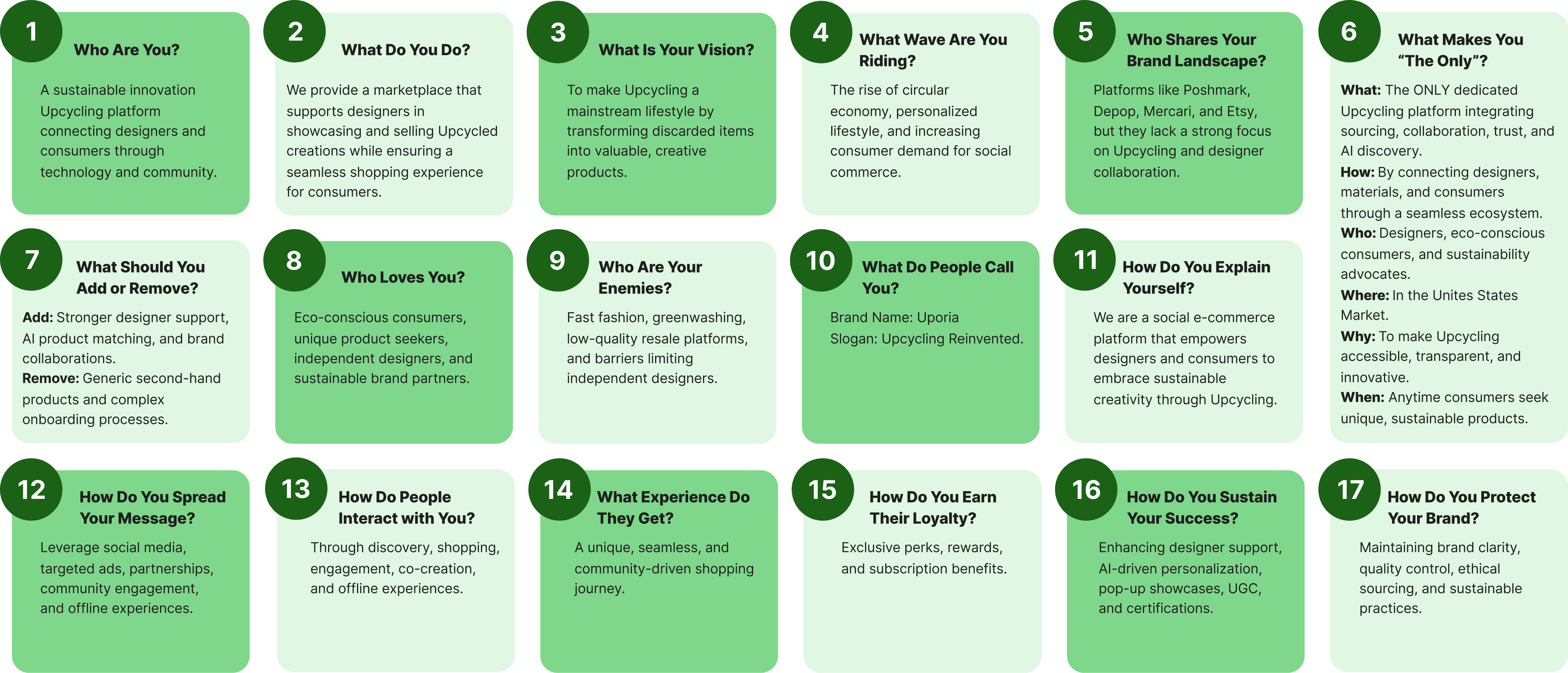 To identify market differentiation and value gaps, I built a 2×2 matrix ("creator engagement × upcycling focus") to analyze our competitor platforms.