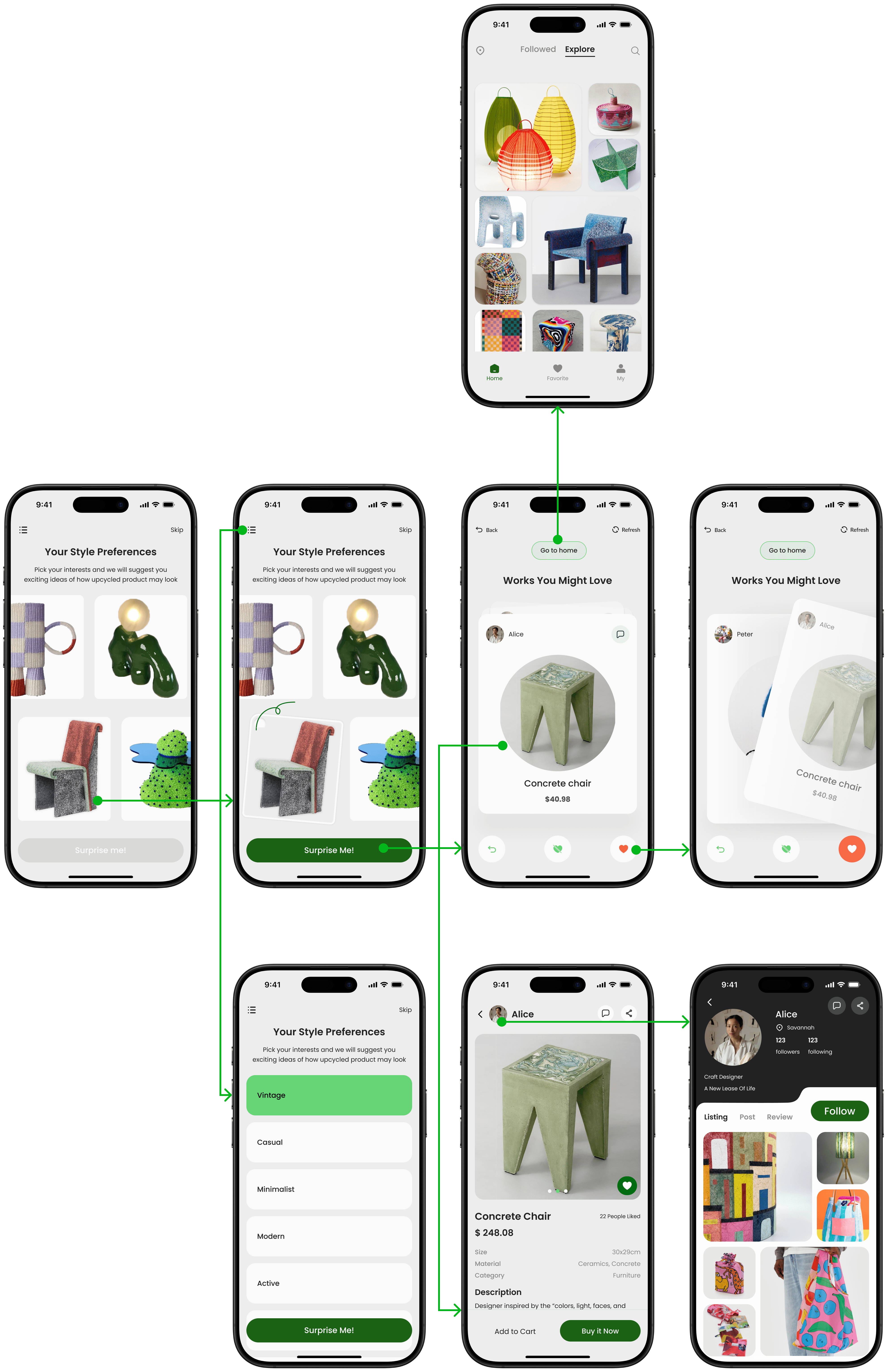 To address upcycling consumers’ unique needs, I move beyond the typical “category-and-filter” approach—designing an emotional, interest-led exploration flow for effortless discovery of style-aligned products and creators.